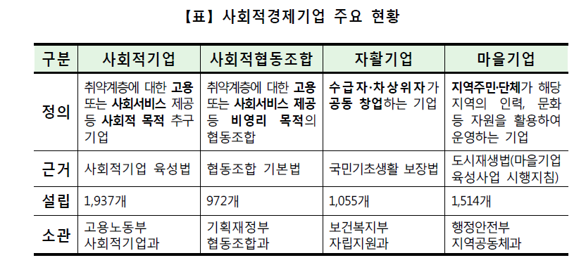 ○ 사회적경제기업은 사회적 가치를 추구하면서 영업활동을 수행하는 기업으로, 취약계층에게 일자리를 제공하는 사회적기업, 사회적협동조합, 자활기업, 마을기업 등을 말한다.