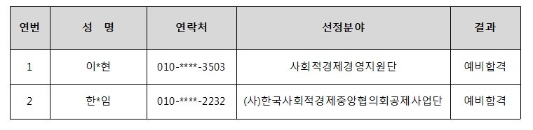 사회적경제 뉴딜 참여자 최종합격자 발표