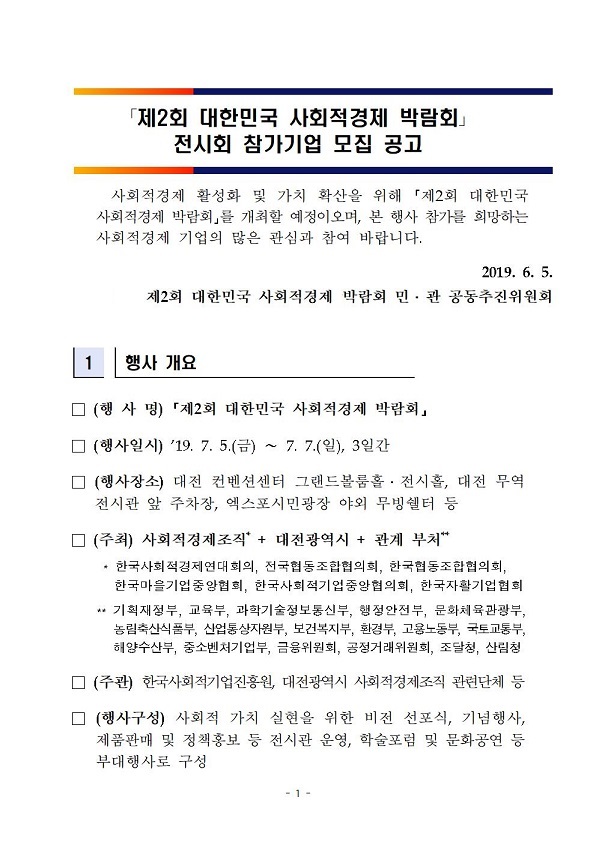 [공고]제2회 대한민국 사회적경제 박람회 전시회 참가기업 모집 공고(~6.17)