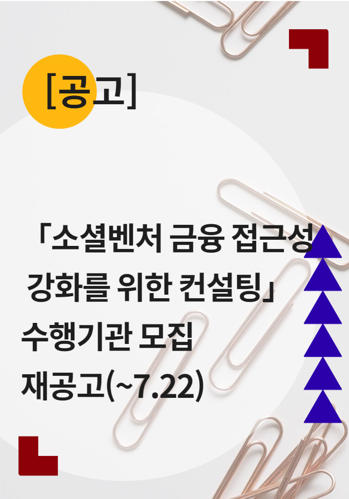 [안내]「소셜벤처 금융 접근성 강화를 위한 컨설팅」 수행기관 모집 재공고(~7.22)