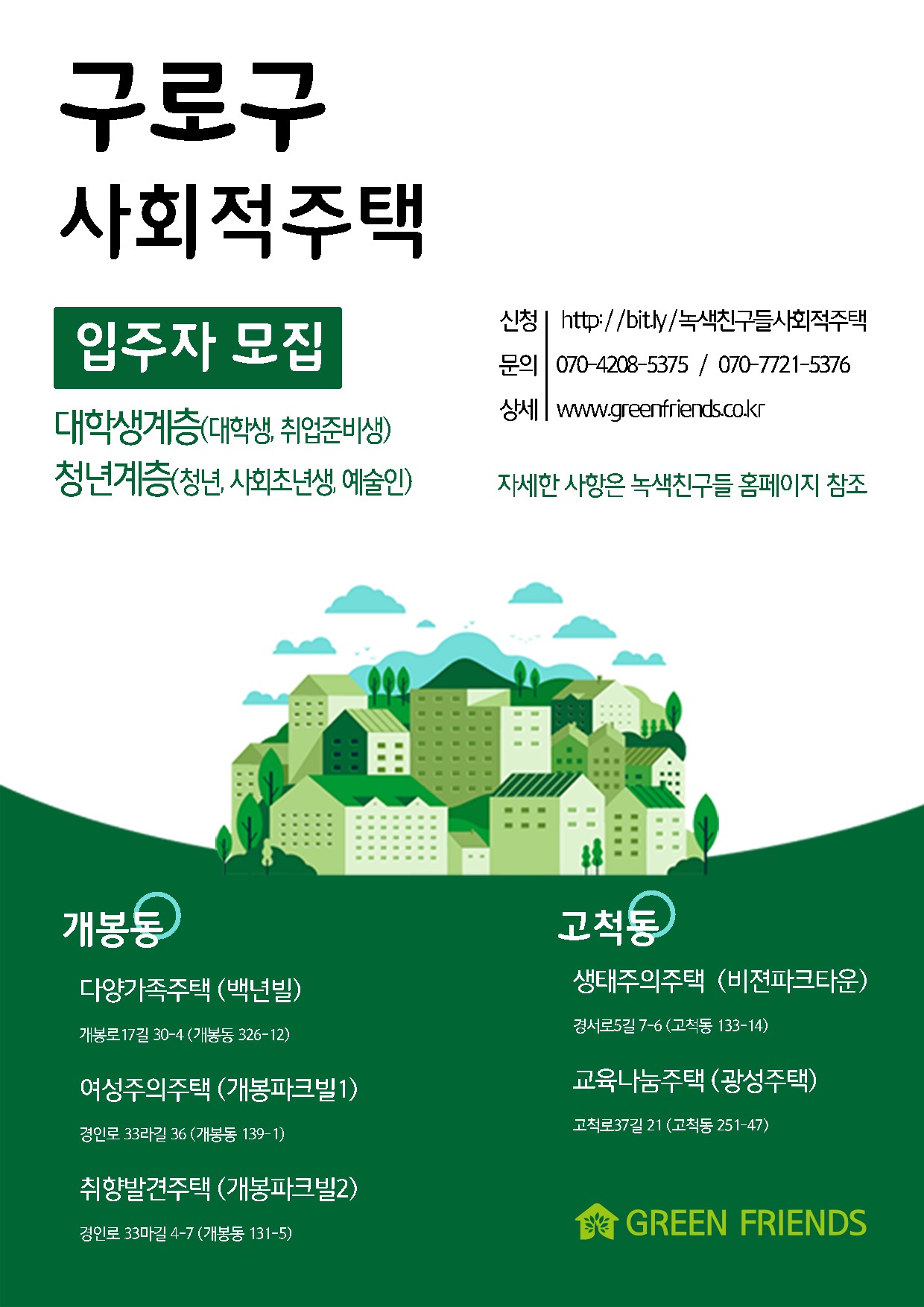 사회적 주택은 청년 주거비 경감 및 안정적 주거지원을 위해 사회적 경제주체(녹색친구들)가 서울주택도시공사 매입임대주택을 활용하여 다양한 주거 서비스 프로그램 등의 임대운영, 관리를 직접 수행하는 임대주택입니다.