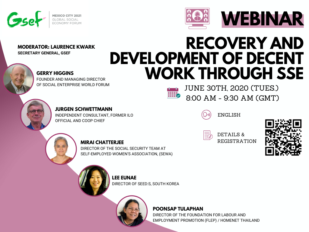 국제사회적경제협의체 사무국에서는 2021년에 개최될 GSEF2021 포럼의 준비 일환으로 멕시코 GSEF2021 조직위원회와 함께 올 한해 사회적경제와 만나는 다양한 주제들을 다룰 수 있는 대화와 협력의 장으로서 온라인 세미나, 웨비나 (webinar, web+seminar)를 준비하고 있습니다.