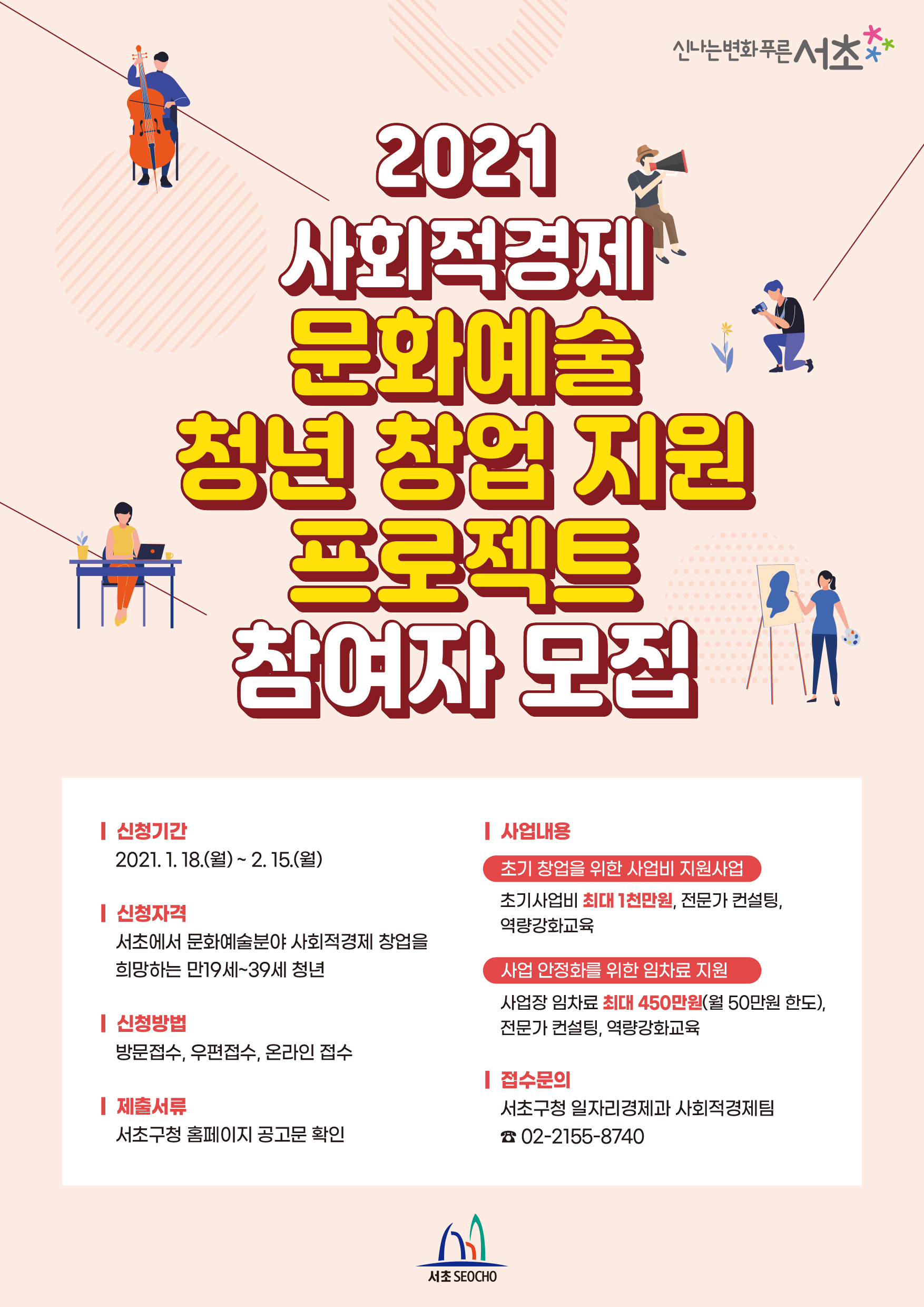 서초구의 문화․예술 자원을 활용하여 지역 내 문제해결 및 발전책이 될 혁신적인 사회적경제 창업 아이디어를 가지고 있는 청년들의 창업활동 및 사업 안정화를 지원하기 위해 「2021 사회적경제 청년 문화예술 창업지원 프로젝트」의 참여자를 다음과 같이 모집하오니, 젊고 패기 넘치는 열정을 지닌 청년 여러분들의 많은 참여바랍니다.
