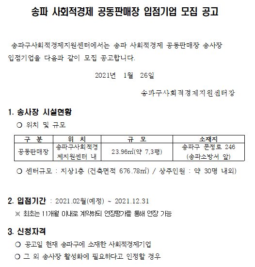 [안내] 송파 사회적경제 공동판매장 입점기업 모집 공고(~2.8)