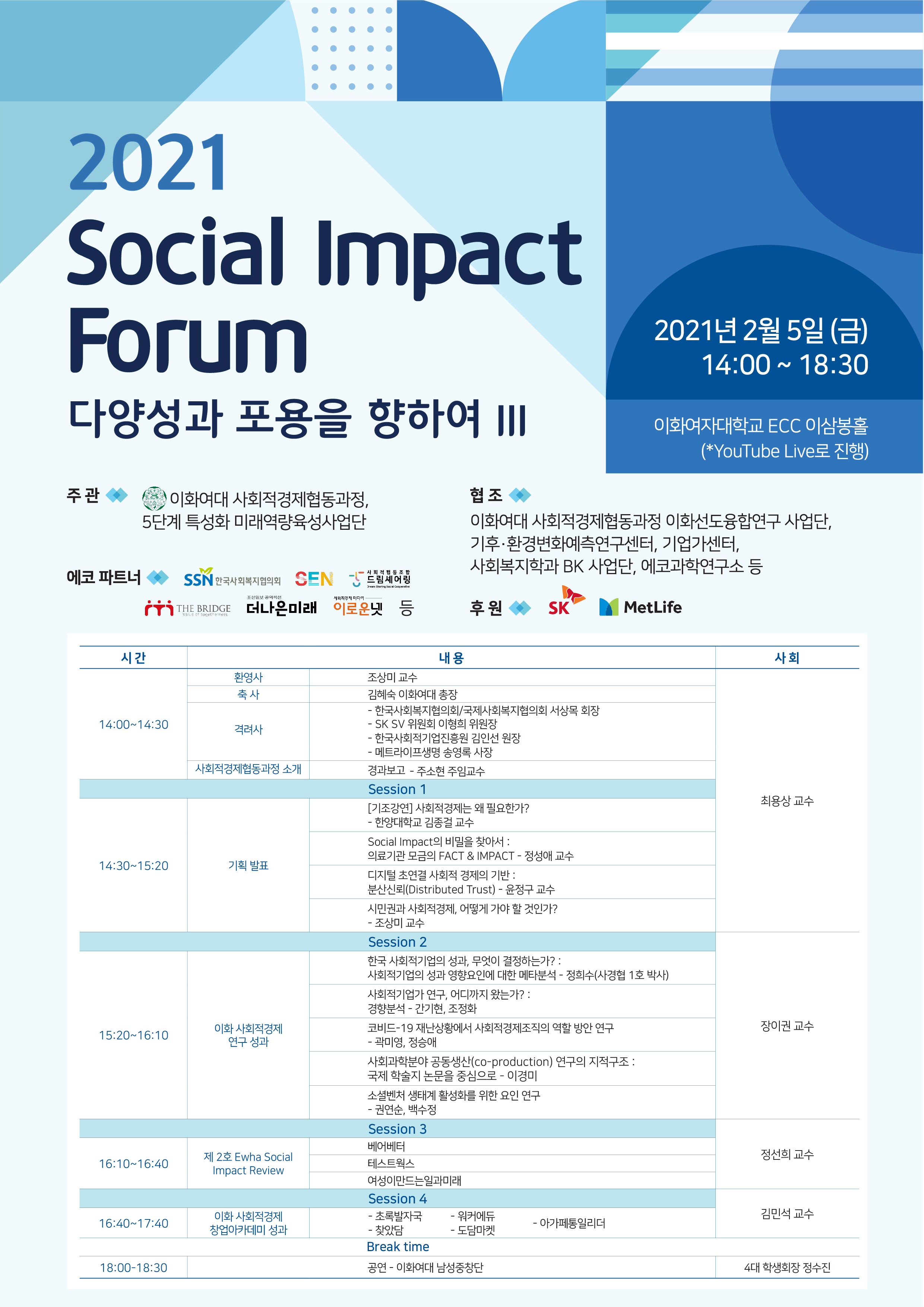 국내 최초 융합형 석·박사과정이 개설된 이화여대 사회적경제협동과정에서 다가오는 2021년 2월 5일 ‘다양성과 포용을 향하여’라는 주제로 제 3회 Social Impact Forum을 개최합니다.