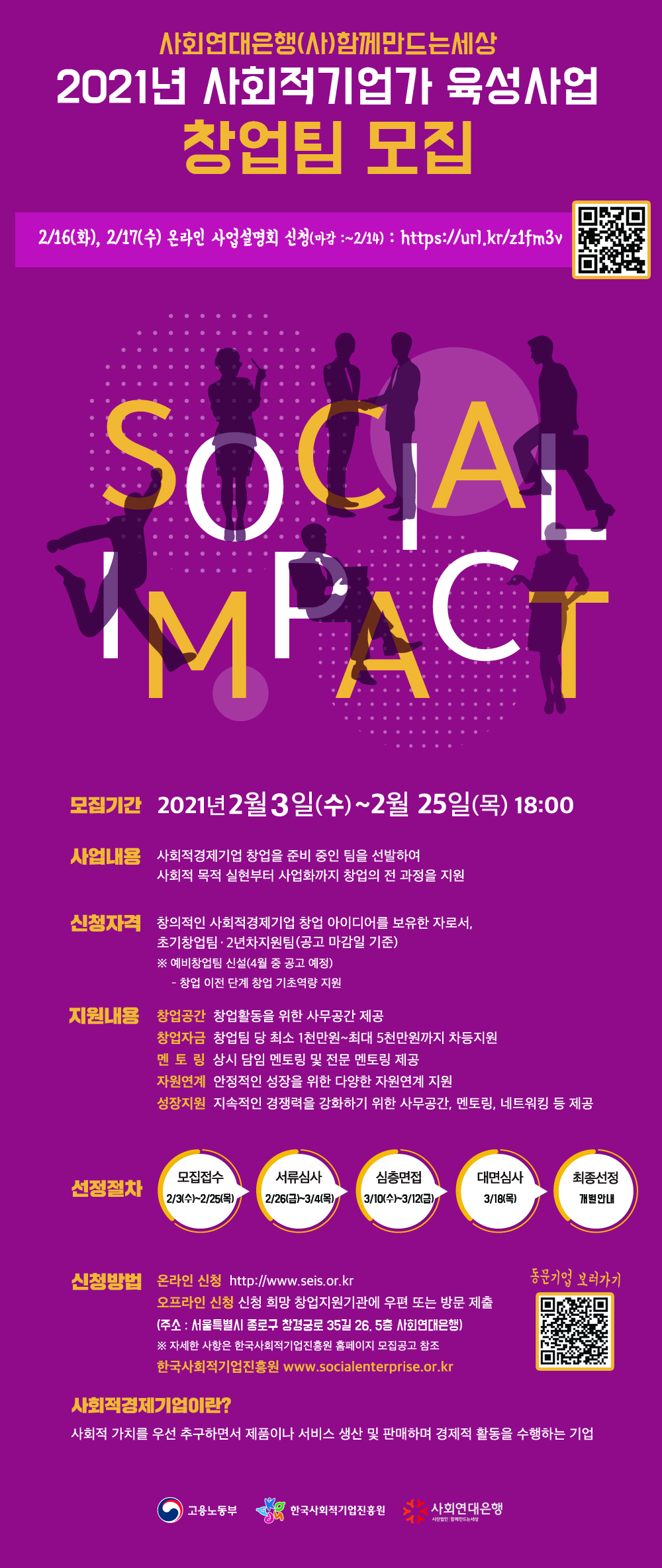 사회연대은행(사)함께만드는세상은 한국사회적기업진흥원에서 주관하는 ‘2021년 사회적기업가 육성사업’에 참가할 창업팀을 모집합니다.