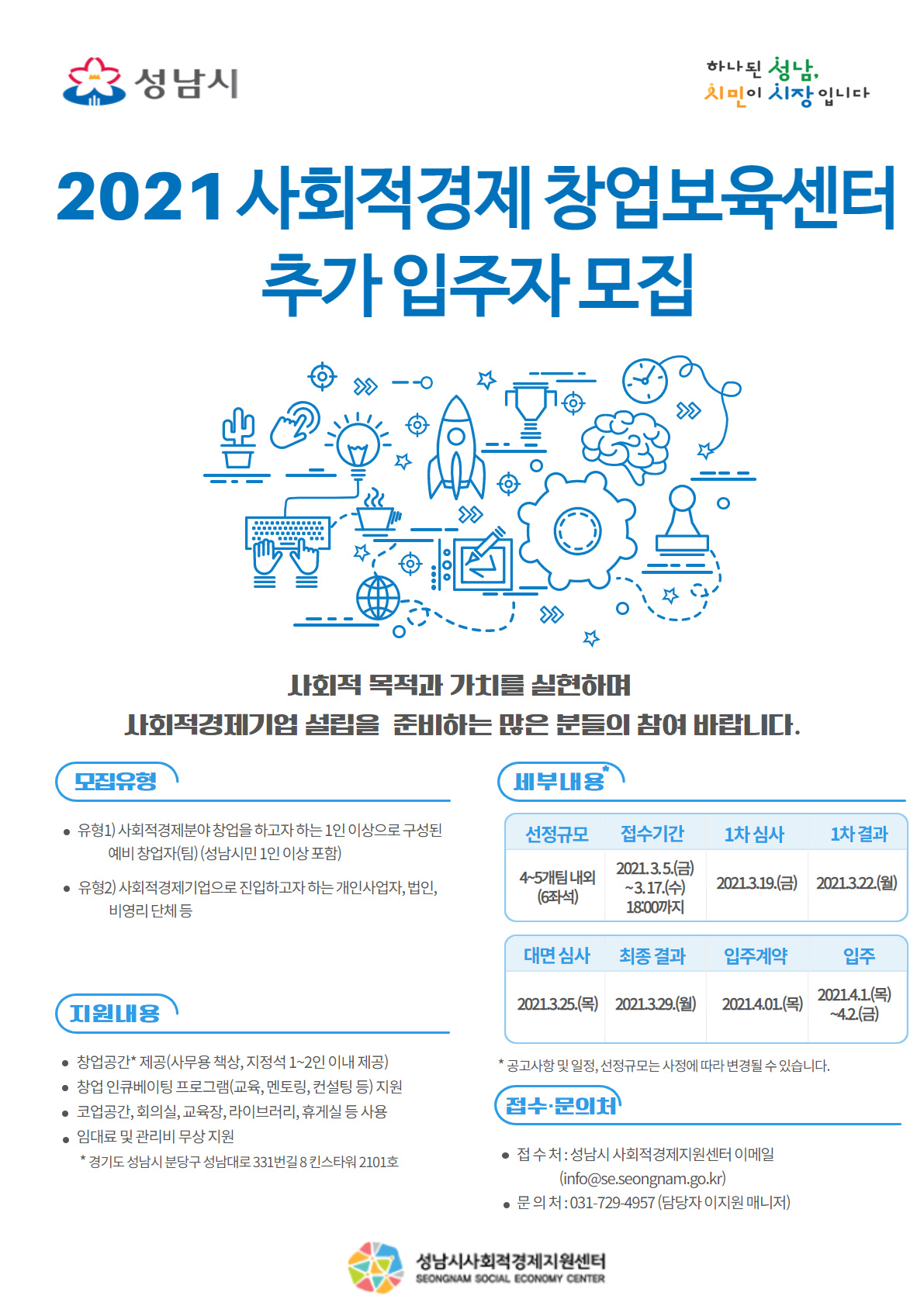 [안내] 2021 성남시 사회적경제 창업보육센터 추가 입주자 모집 (~3.19)