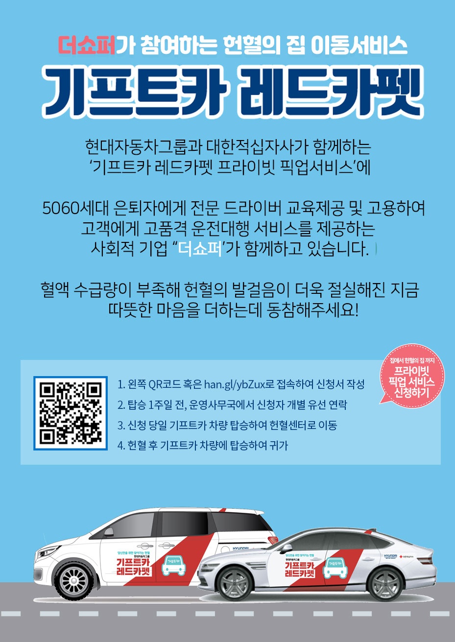 현대자동차그룹과 대한적십자사가 함께하는 ‘기프트카 레드카펫 프라이빗 픽업서비스’에 5060세대 은퇴자에게 전문 드라이버 교육제공 및 고용하여 고객에게 고품격 운전대행 서비스를 제공하는 사회적 기업 “더쇼퍼”가 함께하고 있습니다.