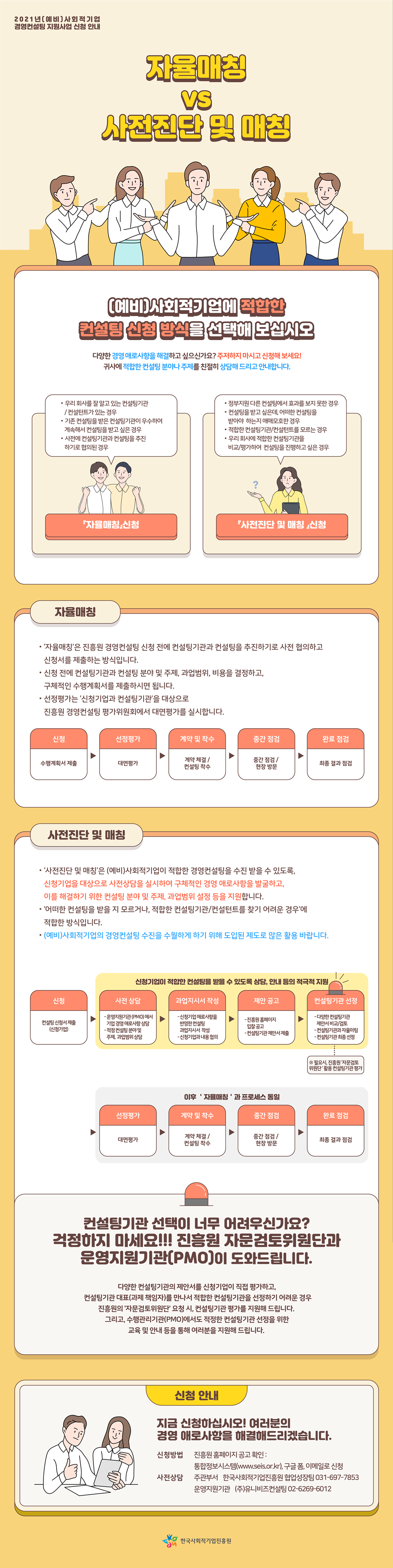 컨설팅 지원에 관심이 있지만 컨설팅 내용과 기관 결정에 고민을 갖고 계신 예비사회적기업 및 사회적기업 여러분의 많은 관심 부탁드립니다.