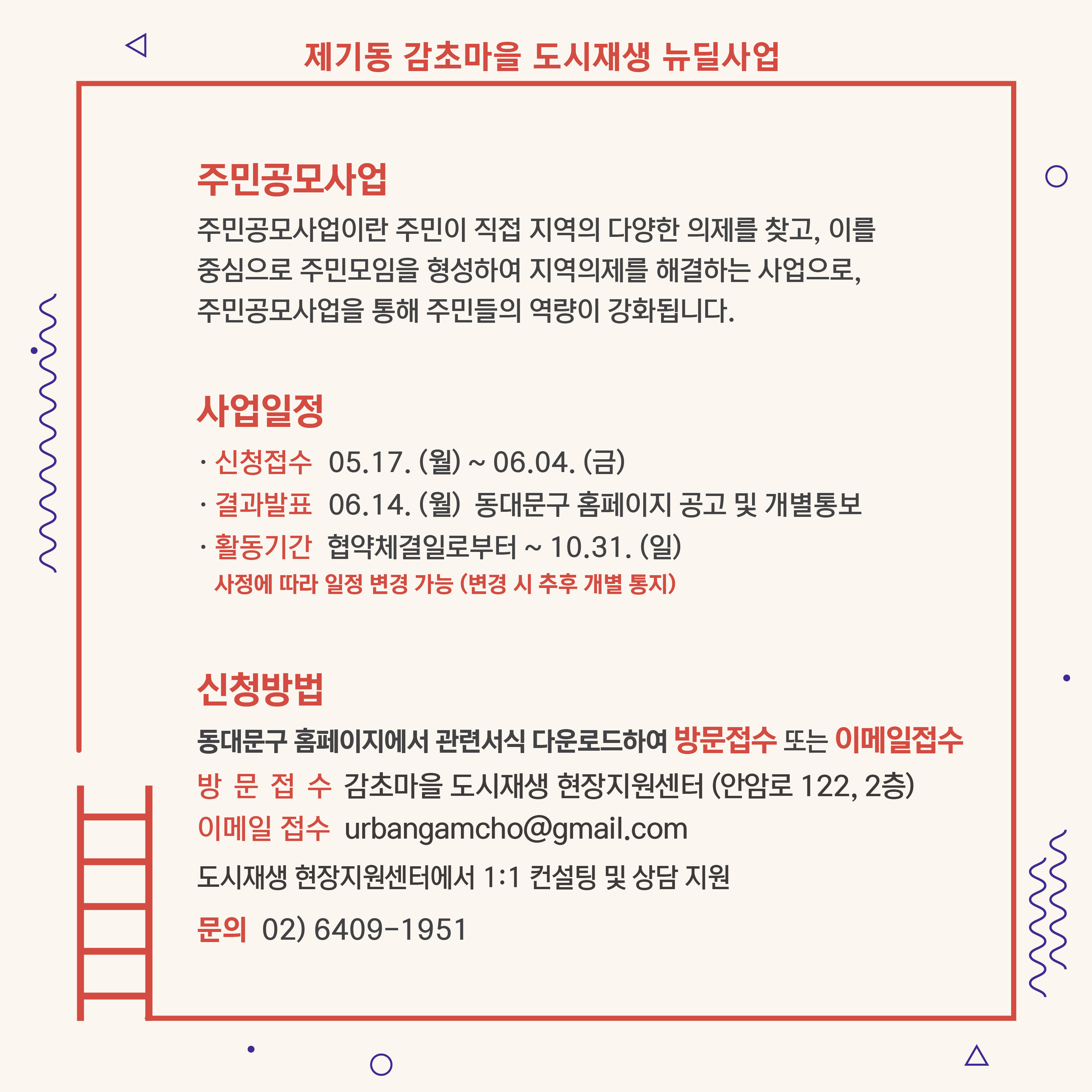 - 방문접수 : 감초마을 도시재생 현장지원센터 (안암로 122, 2층)