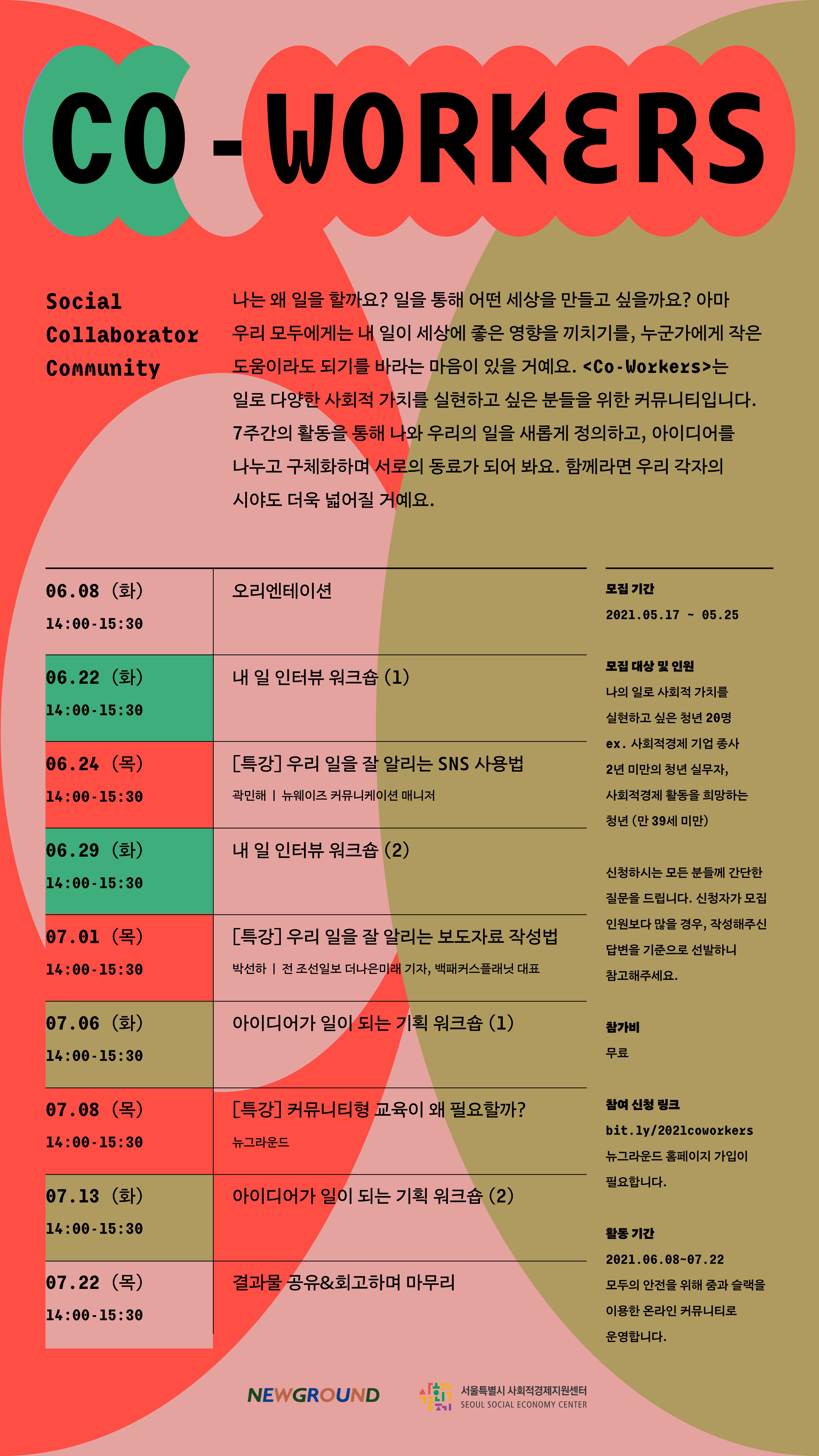 나는 왜 일을 할까요? 일을 통해 어떤 세상을 만들고 싶을까요? 아마 우리 모두에게는 내 일이 세상에 좋은 영향을 끼치기를, 누군가에게 작은 도움이라도 되기를 바라는 마음이 있을 거예요. <Co-Workers>는 일로 다양한 사회적 가치를 실현하고 싶은 분들을 위한 커뮤니티입니다. 7주간의 활동을 통해 나와 우리의 일을 새롭게 정의하고, 아이디어를 나누고 구체화하며 서로의 동료가 되어 봐요. 함께라면 우리 각자의 시야도 더욱 넓어질 거예요.