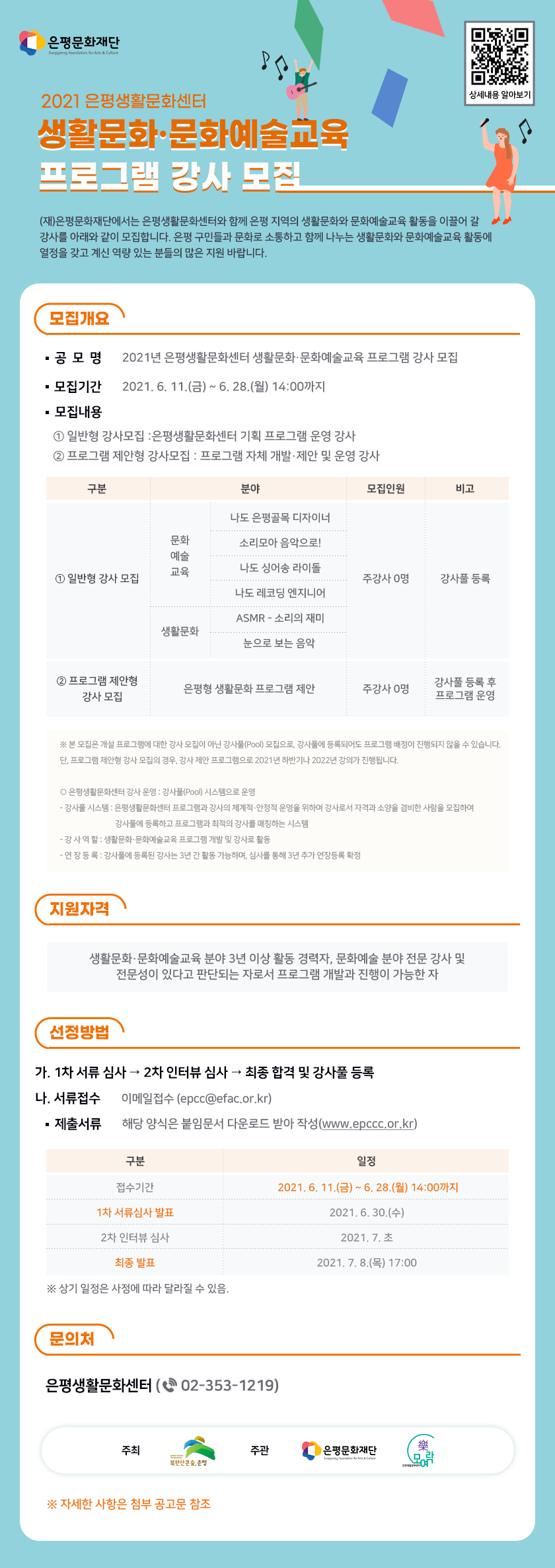 (재)은평문화재단에서는 은평생활문화센터와 함께 은평 지역의 생활문화와 문화예술교육 활동을 이끌어 갈 강사를 아래와 같이 모집합니다.
