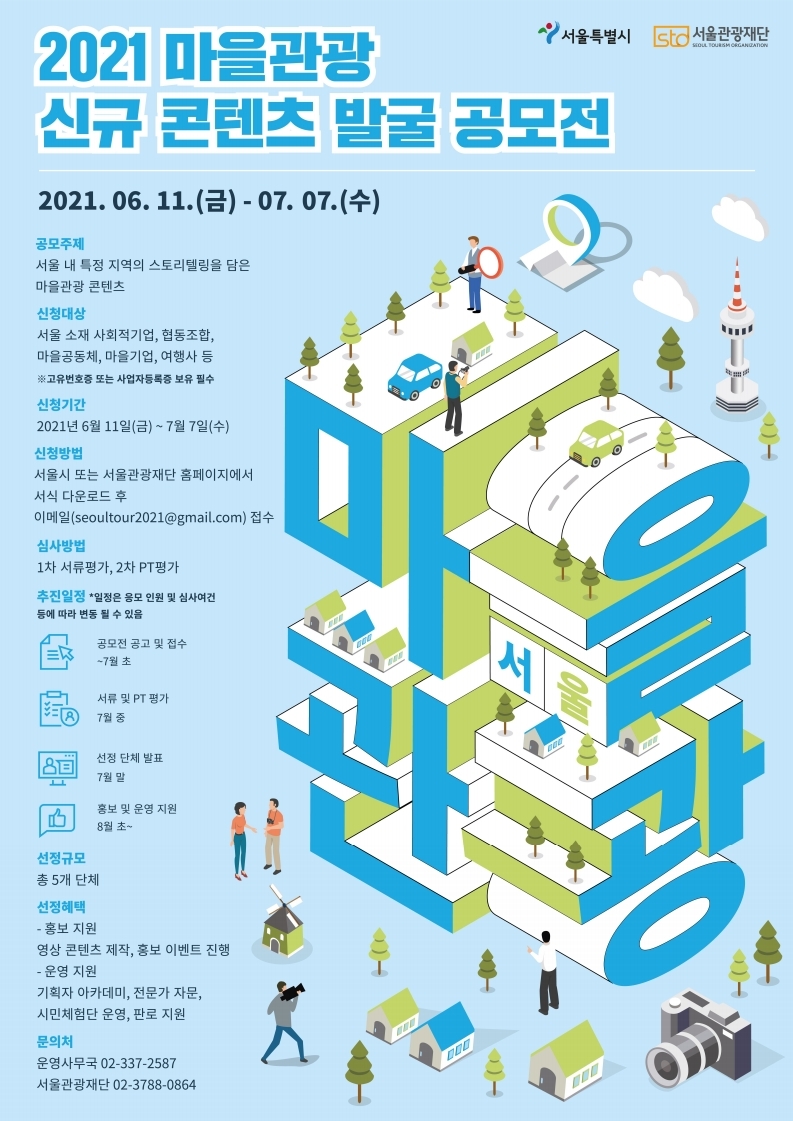 서울시와 서울관광재단은 지역 고유 특색을 담은 숨은 콘텐츠 발굴을 통한로컬관광 활성화 및 마을관광 상품 경쟁력 강화를 위해 『2021 마을관광 신규콘텐츠 발굴 공모전』을 다음과 같이 공고하오니 많은 관심과 참여를 바랍니다.