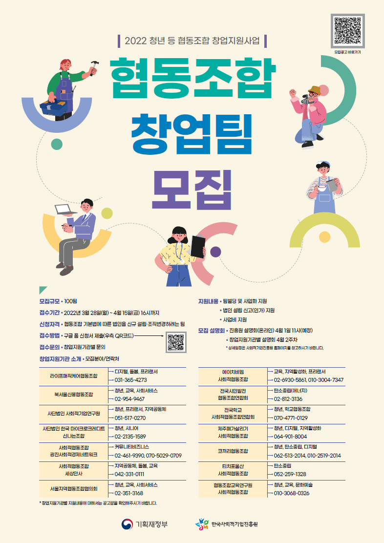[안내] 2022 협동조합 창업지원사업 청년/시니어 창업팀 모집 (~4.15)