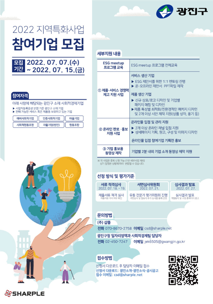 사회적경제기업의 성공적인 온라인 진입 유도를 위하여 사회적경제기업의 기업 경쟁력 제고를 위한 사업과 온라인 판로·홍보 사업을 지원하는 사업을 아래와 같이 추진합니다. 사업에 참여할 광진구 내 사회적경제 기업을 아래와 같이 모집하오니 많은 관심과 참여를 바랍니다.
