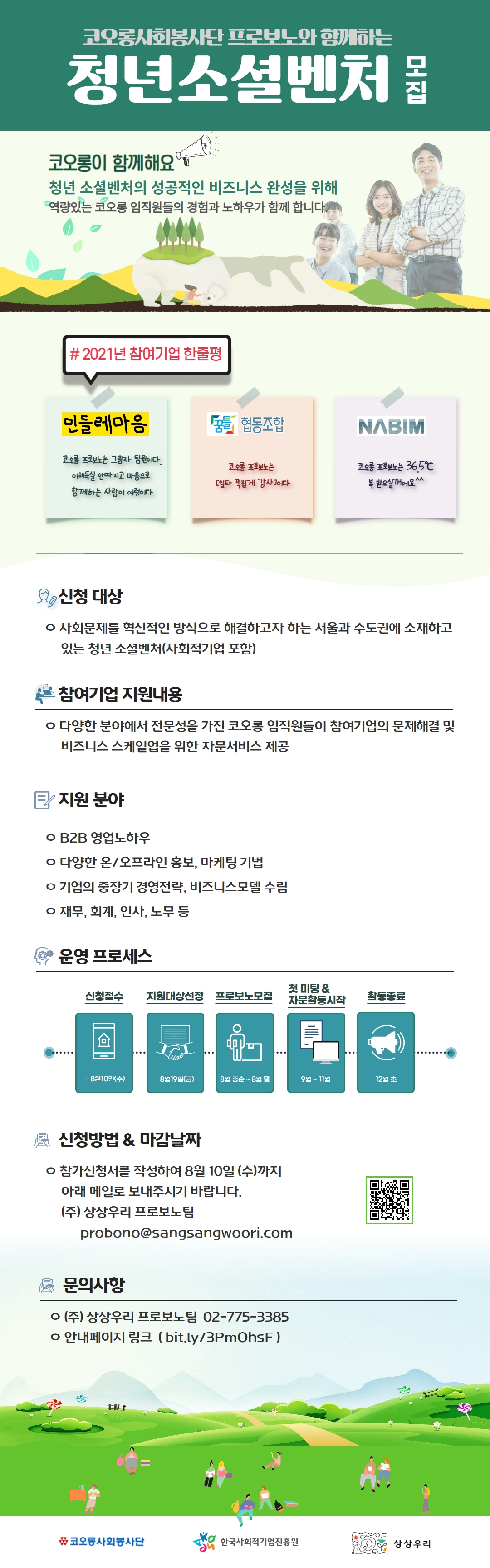 사회적경제 공지 [안내]코오롱사회봉사단 프로보노와 함께하는 청년소셜벤처 모집 (~8.10) 2022-07-22 조회 : 125댓글 : 0 주최/주관 : 코오롱사회봉사단,한국사회적기업진흥원/상상우리 문의 전화 : 02-775-3385 문의 메일 : probono@sangsangwoori.com 모집일정 : 2022-07-22 ~ 2022-08-10 2022_코오롱프로보노_참가신청서_업체명기업소개서-별첨.docx코오롱-참여기업-모집-포스터홍보.jpg 첨부파일 2022_코오롱프로보노_참가신청서_업체명(기업소개서 별첨) (33 kB) 2022_코오롱프로보노_참가신청서_업체명(기업소개서 별첨) 코오롱 참여기업 모집 포스터(홍보) < > 인쇄 목록 수정 댓글이 닫혀있습니다.