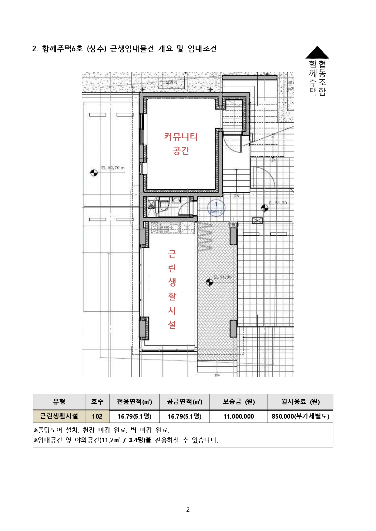 | 근린생활시설 | 102 | 16.79(5.1평) | 16.79(5.1평) | 11,000,000 | 850,000(부가세별도) |