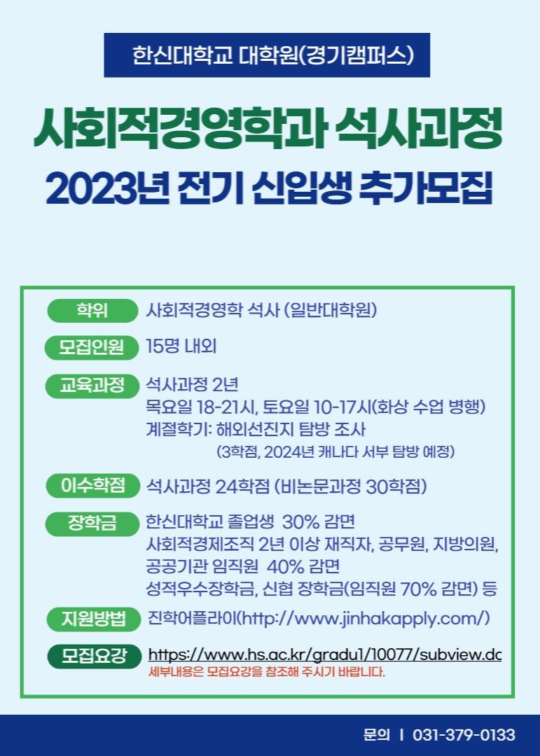 한신대학교 일반대학원 경기캠퍼스 사회적경영학과에서 석사과정 신입생을 추가모집합니다.