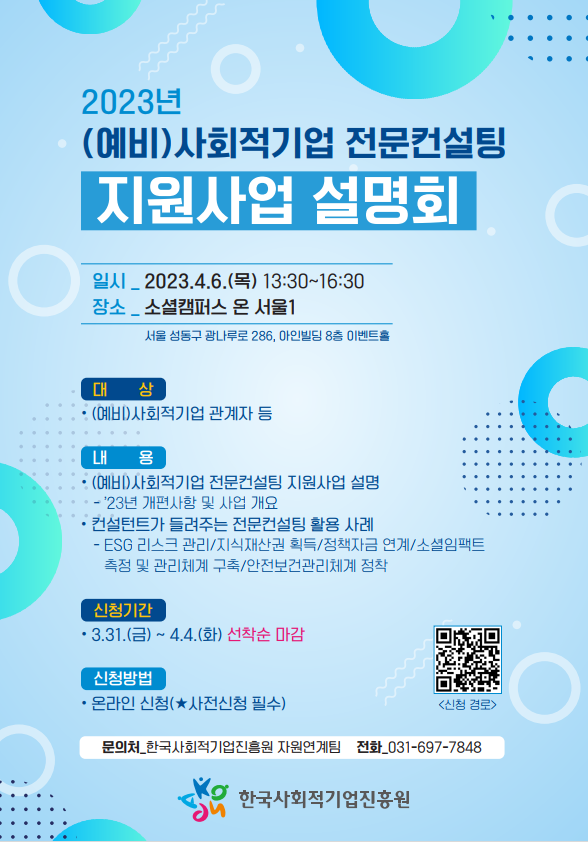 [안내] 한국사회적기업진흥원 2023년 (예비)사회적기업 전문컨설팅 지원사업 설명회 개최 (~4.5.)