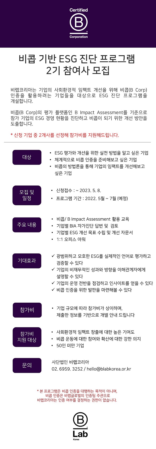 [안내] 비콥 기반 ESG 진단 프로그램 2기 모집 (~5.8.)