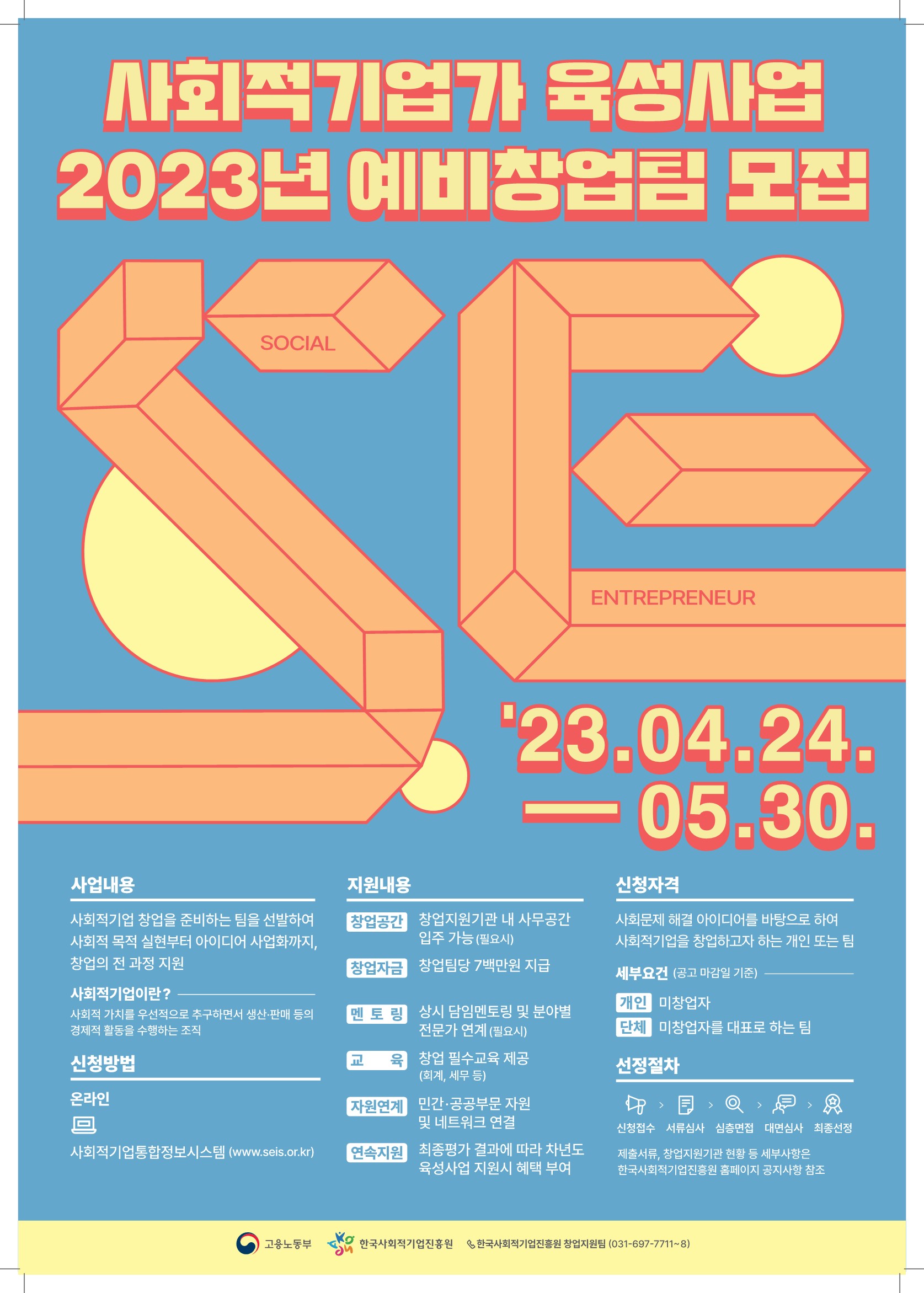 사회적경제 공지 [안내] 사회적기업가 육성사업 예비창업팀 모집 (~5.30.) 2023-04-26 조회 : 105댓글 : 0 주최/주관 : 고용노동부 / 한국사회적기업진흥원 문의 전화 : 031-697-7711 모집일정 : 2023-04-24 ~ 2023-05-30 붙임2-2023년-사회적기업가-육성사업-예비창업팀-신청서식.hwp붙임1-2023년-사회적기업가-육성사업-예비창업팀-모집-공고안.pdf붙임3-2023년-사회적기업가-육성사업-예비창업팀-모집-포스터_1.jpg ※ 자세한 사항은 첨부된 공고문을 참조 바랍니다. 첨부파일 [붙임1] 2023년 사회적기업가 육성사업 예비창업팀 모집 공고(안) (536 kB)[붙임2] 2023년 사회적기업가 육성사업 예비창업팀 신청서식 (39 kB) [붙임2] 2023년 사회적기업가 육성사업 예비창업팀 신청서식 [붙임1] 2023년 사회적기업가 육성사업 예비창업팀 모집 공고(안) [붙임3] 2023년 사회적기업가 육성사업 예비창업팀 모집 포스터_1 < > 인쇄 목록 수정 댓글이 닫혀있습니다.