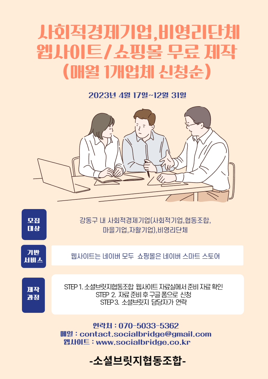 사회적경제 공지 [안내] 강동구 사경기업, 비영리단체 웹사이트/쇼핑몰 무료제작 신청 (~12.31.) 2023-04-27 조회 : 59댓글 : 0 주최/주관 : 소셜브릿지협동조합 문의 전화 : 070-5033-5362 문의 메일 : contact.socialbridge@gmail.com 관련링크 : http://www.socialbridge.co.kr/notice/?uid=597&mod=document&pageid=1 모집일정 : 2023-04-17 ~ 2023-12-31 아래링크를 클릭해주세요 http://www.socialbridge.co.kr/notice/?uid=597&mod=document&pageid=1 < > 인쇄 목록 수정 댓글이 닫혀있습니다.
