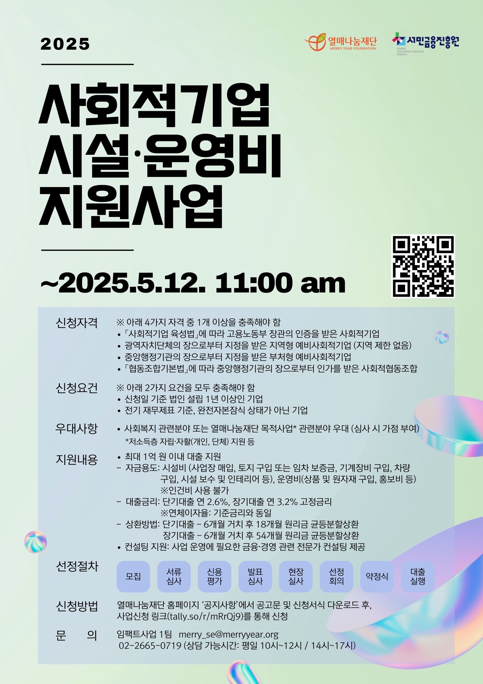 2025년 1차 사회적기업 시설·운영비 지원사업 참여기업 모집(~5.12 11:00)