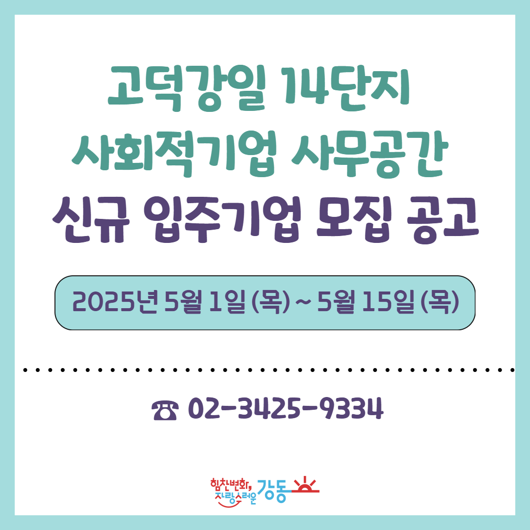 [강동구/강동구사회적경제지원센터] 고덕강일 14단지 사회적기업 사무공간 신규 입주기업 모집 공고 (~5.15.)