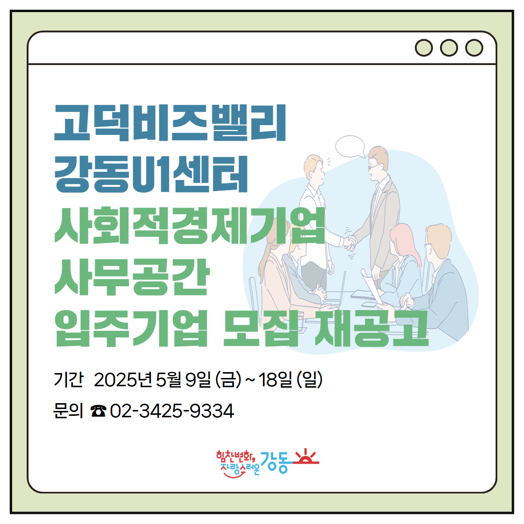 사회적경제 공지 [강동구/강동구 사회적경제지원센터] 고덕비즈밸리 강동U1센터 사회적경제기업 사무공간 입주기업 모집 재공고 (~5.18.) 2025-05-09 조회 : 104댓글 : 0 주최/주관 : 강동구/강동구 사회적경제지원센터 문의 전화 : 0234259334 문의 메일 : kdkim@gd.go.kr 관련링크 : https://gdse.org/?page_id=199&mod=document&uid=909 U1센터-홍보-웹자보1.jpg강동구-고덕비즈밸리-강동U1센터-사회적경제기업-사무공간-입주기업-모집-재공고문.hwp등-별지서식.hwp 첨부파일 강동구-고덕비즈밸리-강동U1센터-사회적경제기업-사무공간-입주기업-모집-재공고문 (934 kB)등-별지서식 (72 kB) U1센터-홍보-웹자보1 강동구-고덕비즈밸리-강동U1센터-사회적경제기업-사무공간-입주기업-모집-재공고문 등-별지서식 < > 인쇄 목록 수정 댓글이 닫혀있습니다.