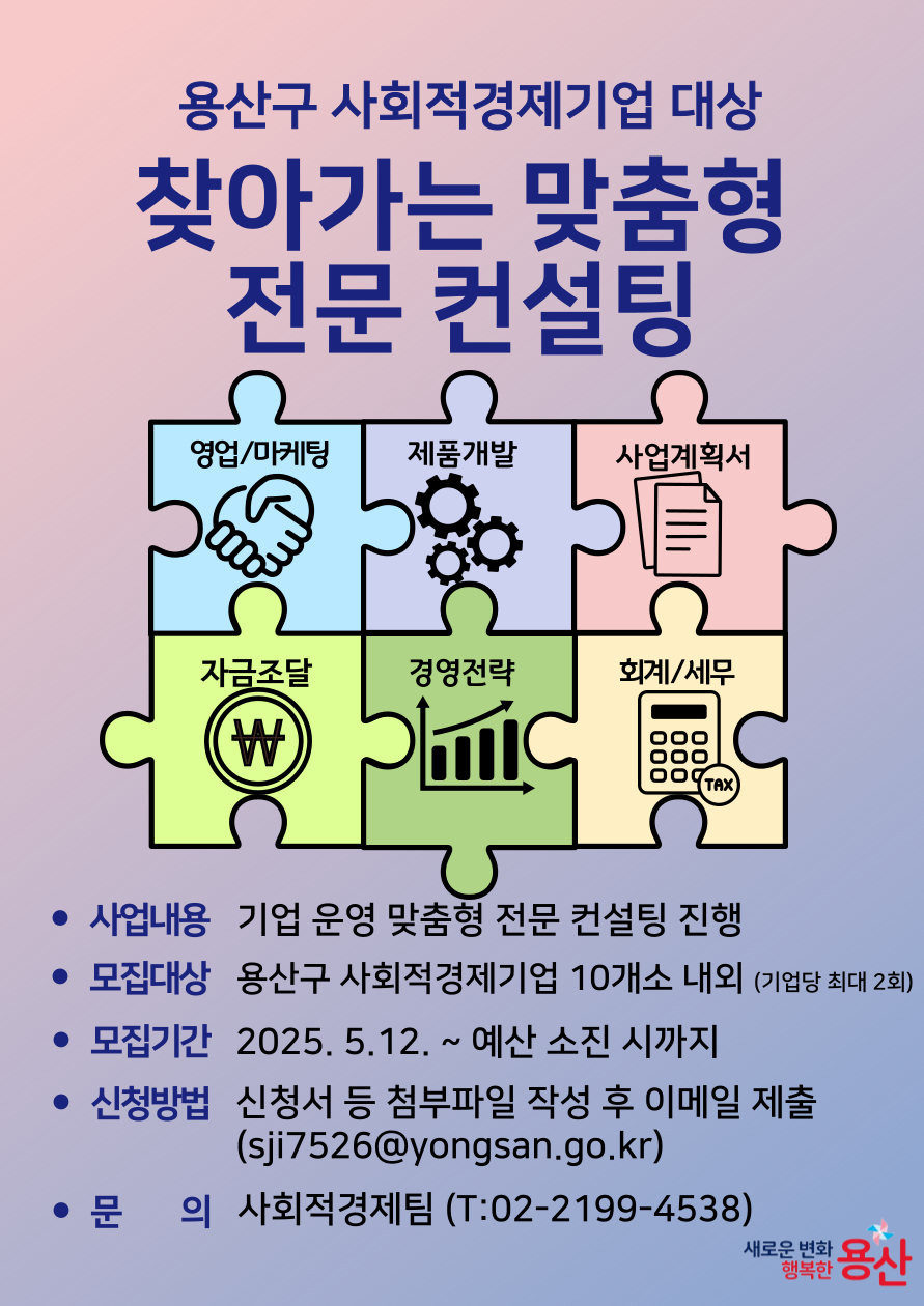용산구 사회적경제기업 대상으로 기업의 경쟁력 강화와 안정적인 운영을 마련하고자 2025년 찾아가는 맞춤형 전문 컨설팅을 진행합니다.