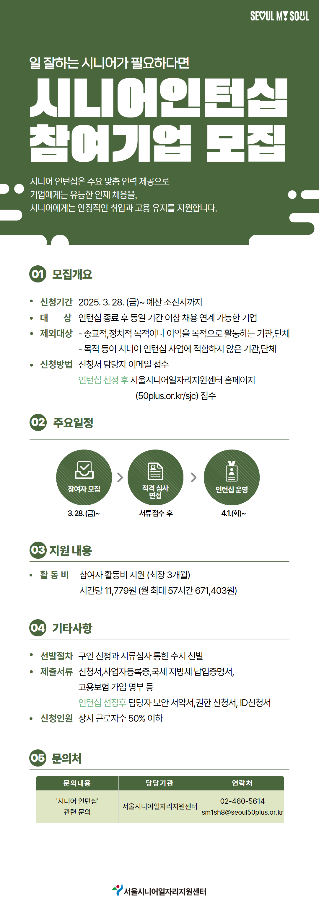 사회적경제 공지 [서울 시니어인턴십] 참여기업 모집 : 3개월간 인건비 지원 2025-05-13 조회 : 194댓글 : 0 주최/주관 : 서울50플러스재단 시니어일자리지원센터 문의 전화 : 02-460-5613 문의 메일 : dongbu100@50plus.or.kr 관련링크 : https://www.50plus.or.kr/in_appView.do?ANN_NO=766&setPageIndex=1 3.-시니어-인턴십_기업-신청서.hwp2.-시니어-인턴십_기업모집-홍보물.jpg 첨부파일 3.-시니어-인턴십_기업-신청서 (52 kB) 3.-시니어-인턴십_기업-신청서 2.-시니어-인턴십_기업모집-홍보물 < > 인쇄 목록 수정 댓글이 닫혀있습니다.