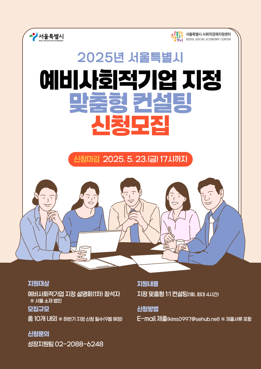 서울시 예비사회적기업 육성과 발굴을 위해 「2025년 서울특별시 예비사회적기업 지정 맞춤형 컨설팅 지원사업 참여기업」모집공고를 추진하고자 하오니 많은 관심과 적극적인 참여를 바랍니다.