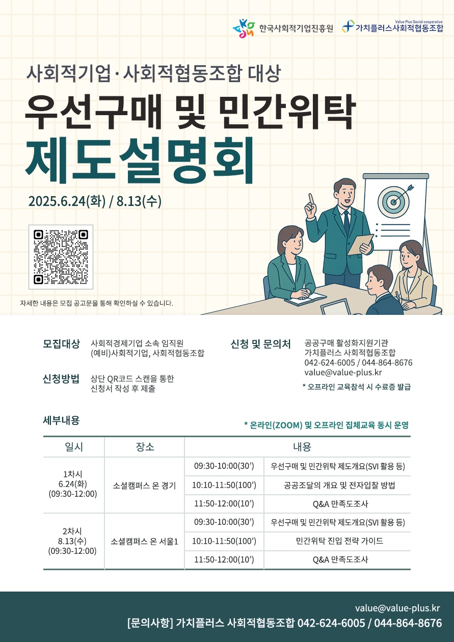 다가오는 6/24(화), 8/13(수) 총 2일에 걸쳐 우선구매 및 민간위탁 제도 설명회를 개최하게 되었습니다.