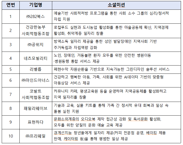 □ 올해 선정된 2025 소셜 임팩트 우수기업은 ‘282북스’, ‘건강한농부 사회적협동조합’, ‘(주)공위지’, ‘네츠모빌리티’, ‘리벨롭’, ‘(주)마인드아너스’, ‘코발트 사회적협동조합’, ‘패밀리웨이브’, ‘표현하다’, ‘(주)프리웨일’로 총 10개 기업이다.