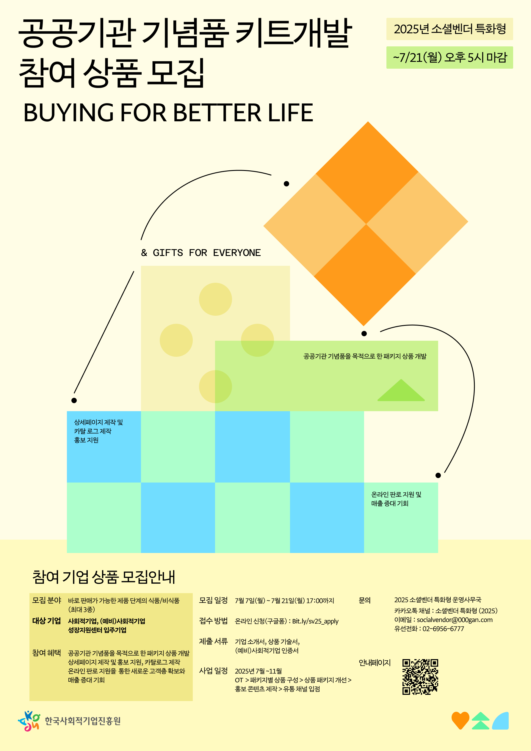 사회적기업의 지속성장 기반 마련을 지원하는『2025년 소셜벤더 운영사업』특화형에 참여할 분야의 기업(상품)을 다음과 같이 모집하오니, 관심 있는 기업의 많은 신청 바랍니다.
