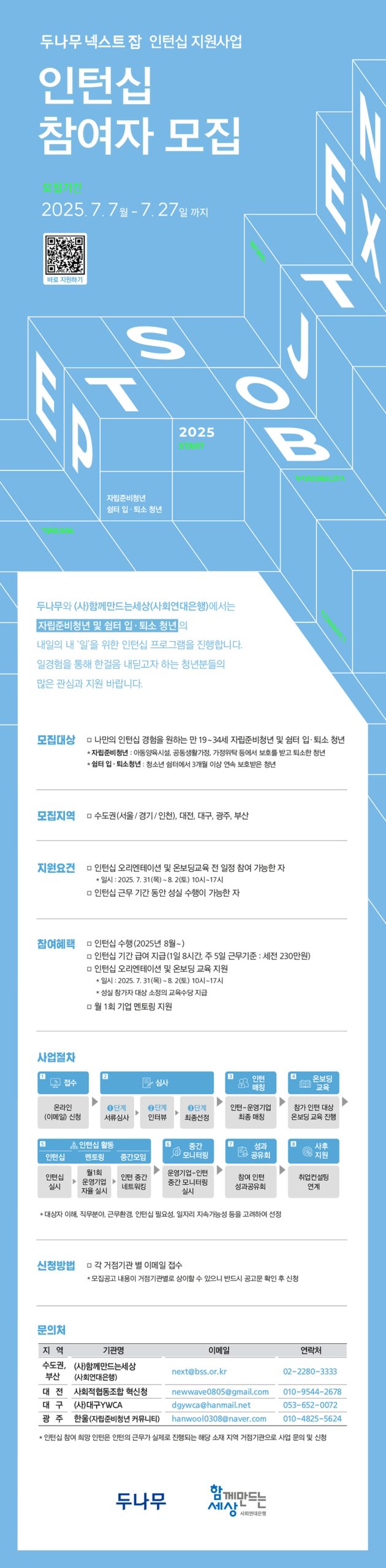 두나무와 (사)함께만드는세상(사회연대은행)에서는 자립준비청년 및 쉼터 입퇴소 청년의 내일의 내, 일을 위한 인턴십 프로그램을 진행합니다. 일경험을 통해 한걸음 내딛고자 하는 청년분들의 많은 관심과 지원 바랍니다:)