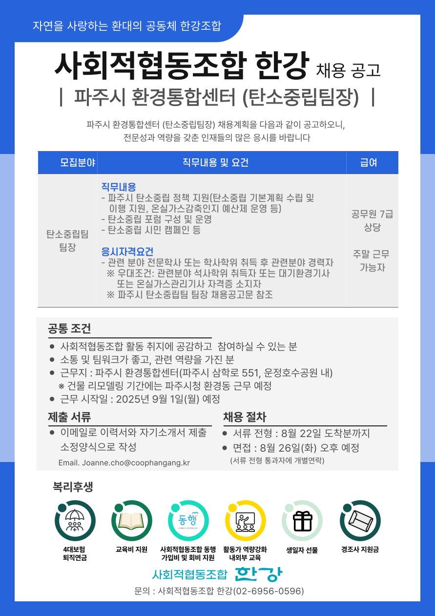 사회적협동조합 한강_파주시 환경통합센터 ‘탄소중립팀장’ 채용계획 공고