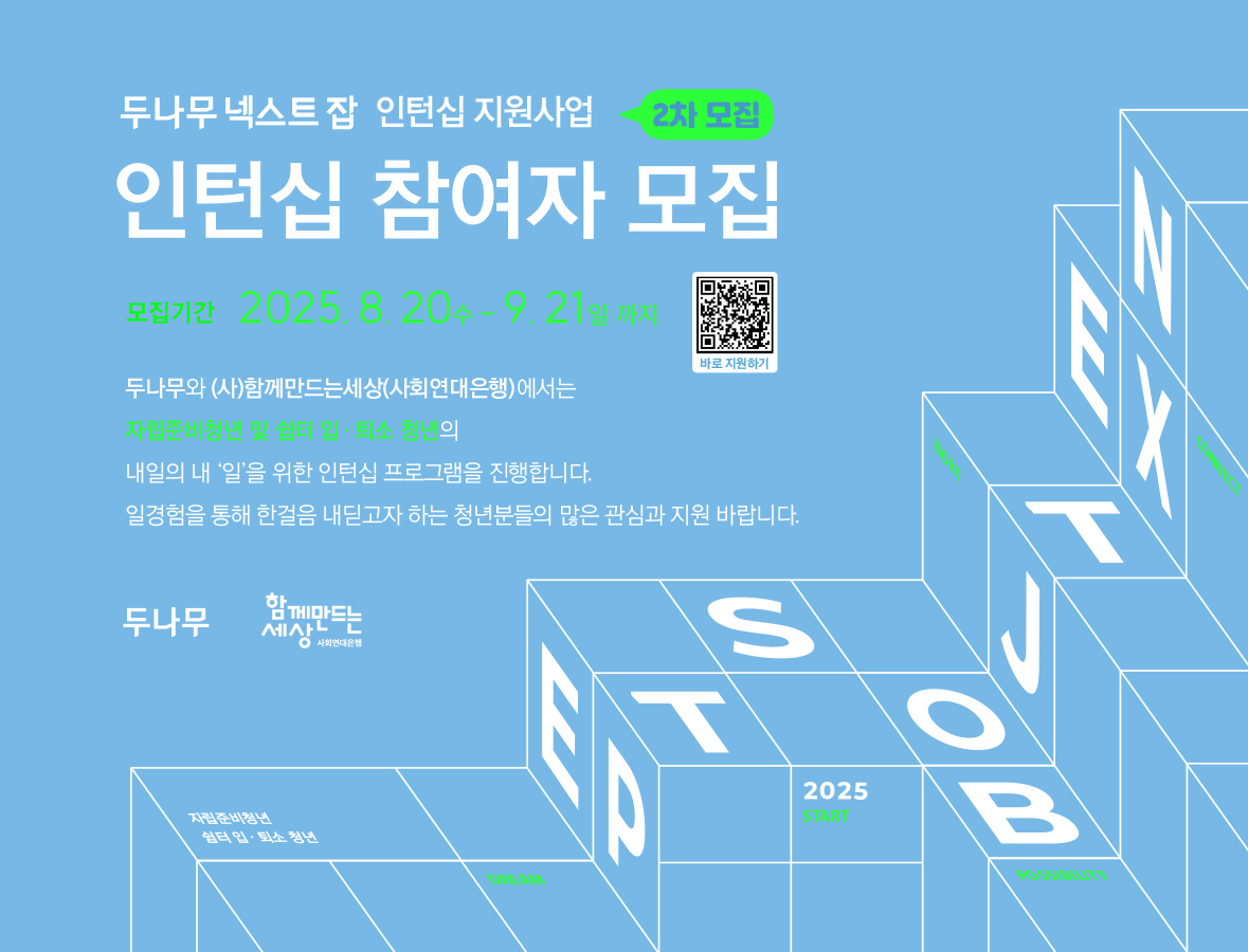 두나무와 (사)함께만드는세상(사회연대은행)에서는 자립준비청년 및 쉼터 입퇴소 청년의 내일의 내, 일을 위한 인턴십 프로그램을 진행합니다. 일경험을 통해 한걸음 내딛고자 하는 청년분들의 많은 관심과 지원 바랍니다:)