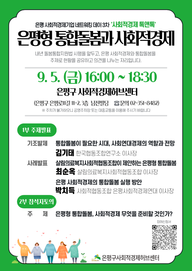가. 행 사 명 : 은평 사회적경제기업 네트워킹 데이 3차 ‘사회적경제 톡앤톡’ 은평형 통합돌봄과 사회적경제 나. 일 시 : 2025. 9. 5. (금) 16:00 ~ 18:30 다. 장 소 : 은평구 사회적경제허브센터(은평로 11길 11-2, 3층 남전빌딩) ※ 주차가 어려우니 대중교통 및 인근 공영주차장을 이용하시길 바랍니다. 라. 내 용