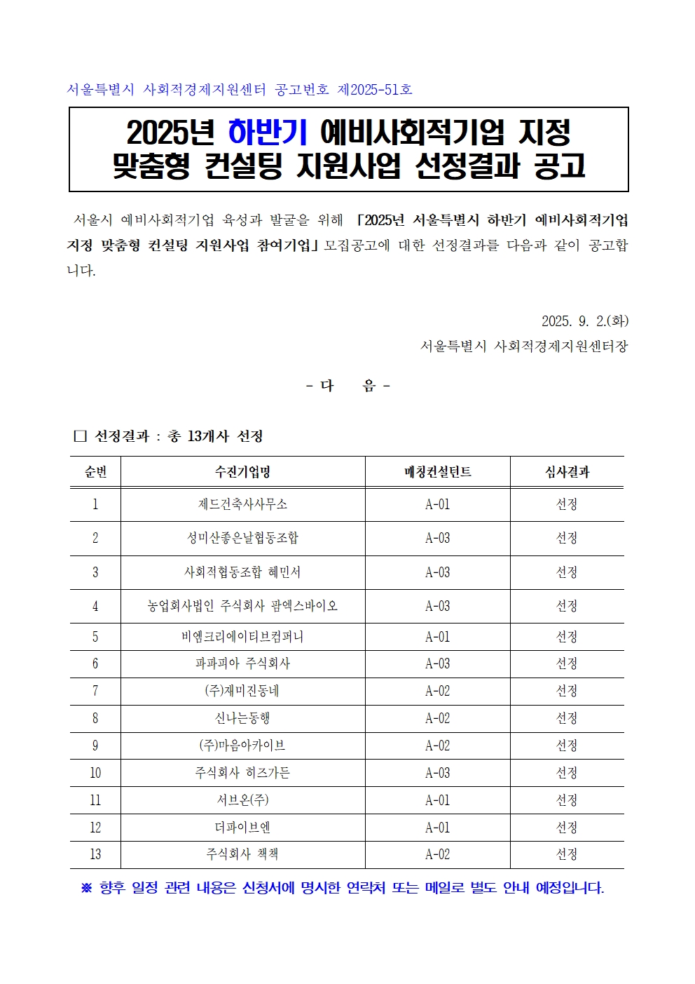 사회적경제 공지 (공고) 2025년 하반기 예비사회적기업 지정 맞춤형 컨설팅 지원사업 선정결과 2025-09-04 조회 : 380댓글 : 0 주최/주관 : 서울특별시 사회적경제지원센터 문의 전화 : 02-2088-6248 문의 메일 : as1018ss@sehub.net 2.-2025년-하반기-예비사회적기업-지정-맞춤형-컨설팅-지원사업-선정심사-결과-공고001.jpg 2.-2025년-하반기-예비사회적기업-지정-맞춤형-컨설팅-지원사업-선정심사-결과-공고001 < > 인쇄 목록 수정 댓글이 닫혀있습니다.