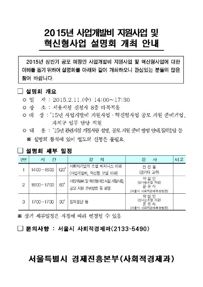 [안내] 2015년 사업개발비 지원사업 및 혁신형사업 설명회 개최 안내(2.11)