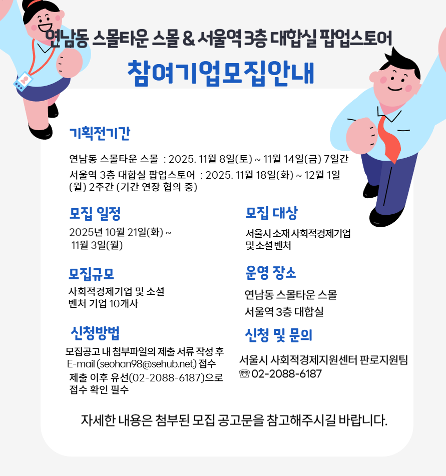 [공고]2025 연남동 스몰타운 스몰 &서울역 3층 대합실 팝업스토어 참여기업 모집(~11.3/월 23:59까지)