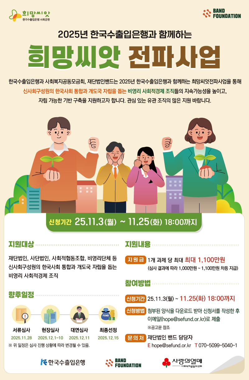 2025년 한국수출입은행과 함께하는 희망씨앗전파사업은 한국수출입은행과 사회복지공동모금회, 재단법인밴드가 신사회구성원의 한국사회 통합과 개도국 자립을 돕는 비영리조직들의 지속가능성을 높이고, 자립 가능한 기반 구축을 지원하고자 추진하고 있는 사업입니다. 관심 있는 유관 조직의 많은 지원 바랍니다.