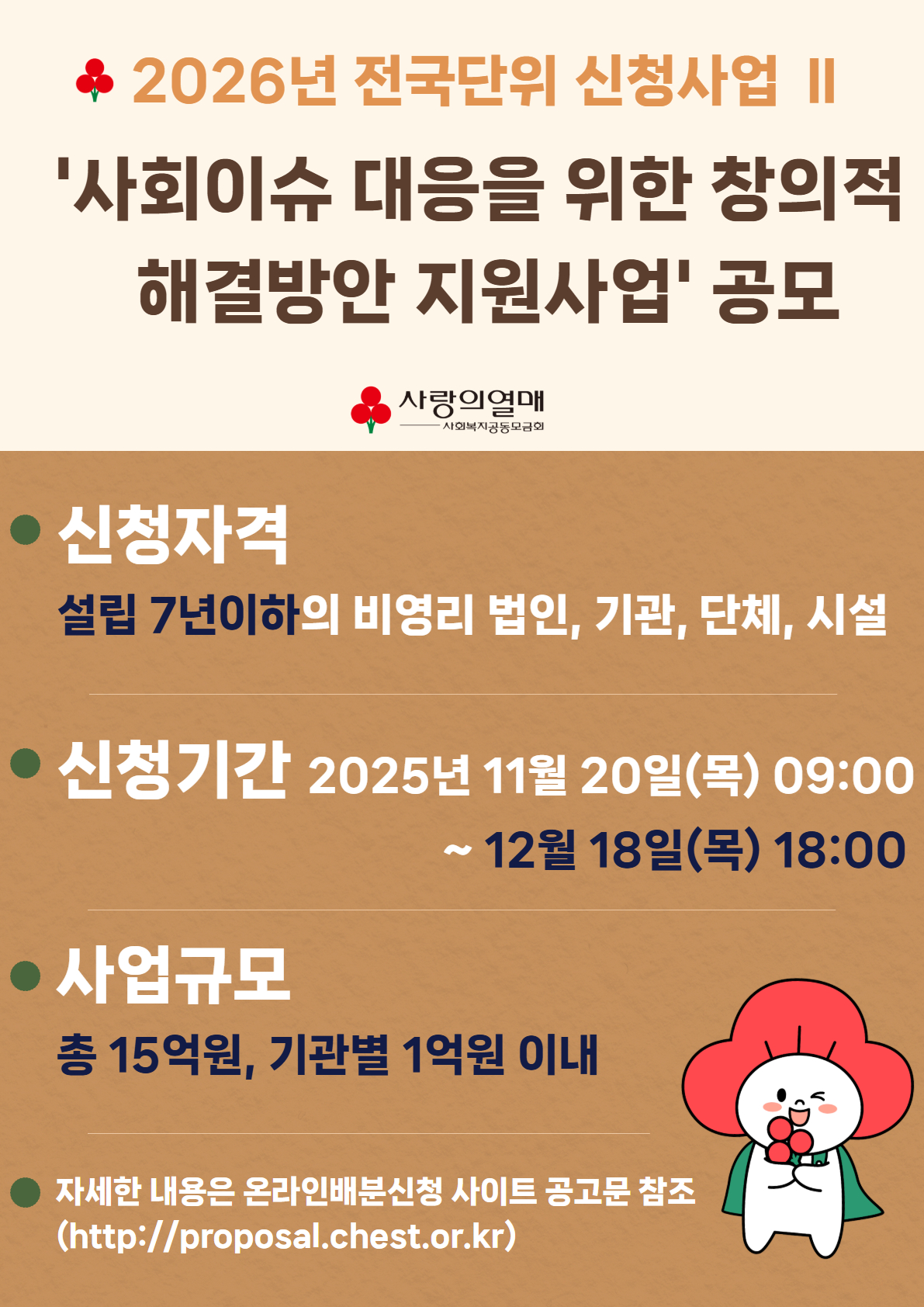 사회적경제 공지 [사회복지공동모금회] 2026년 전국단위 신청사업ll ‘사회이슈 대응을 위한 창의적 해결방안 지원사업’ 공모 안내 (~12/18) 2025-11-21 조회 : 126댓글 : 0 주최/주관 : 사회복지공동모금회 문의 전화 : 02-6262-3133 문의 메일 : jtlovekj@chest.or.kr 관련링크 : https://proposal.chest.or.kr/ < > 인쇄 목록 수정 댓글이 닫혀있습니다.