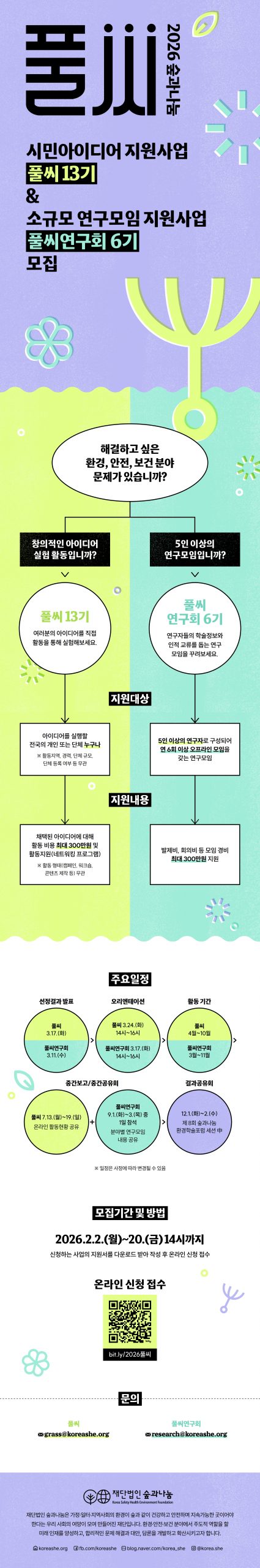 [숲과나눔] 2026 환경·안전·보건 아이디어 지원 풀씨 13기 & 소규모 연구모임 지원 풀씨연구회 6기 모집(~2/20 14시)