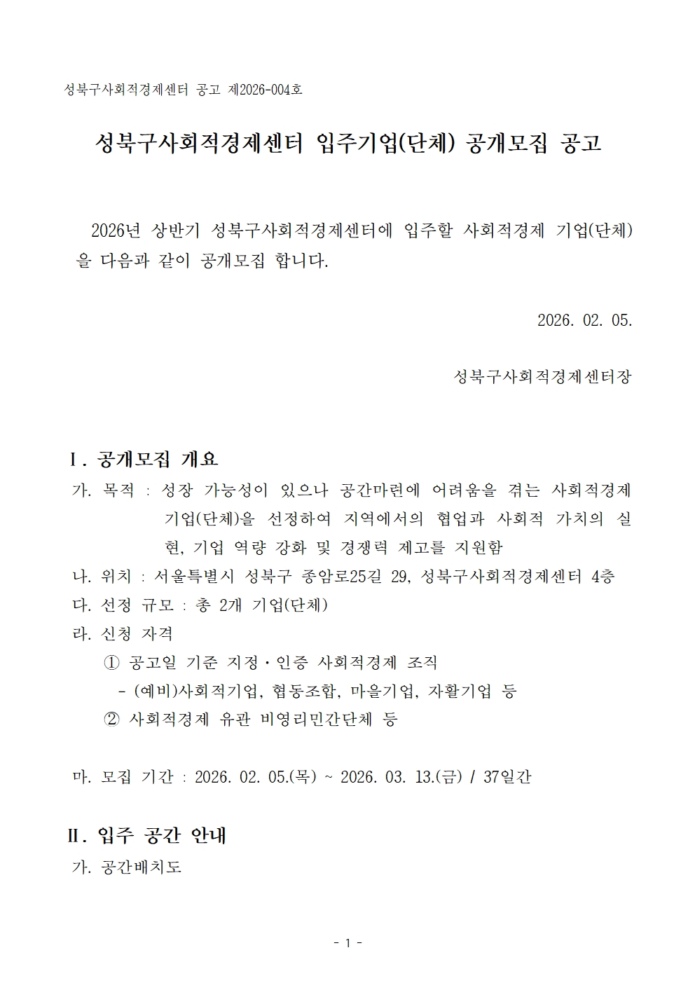 성북구사회적경제센터 입주기업(단체) 공개모집 공고(~03.13.)