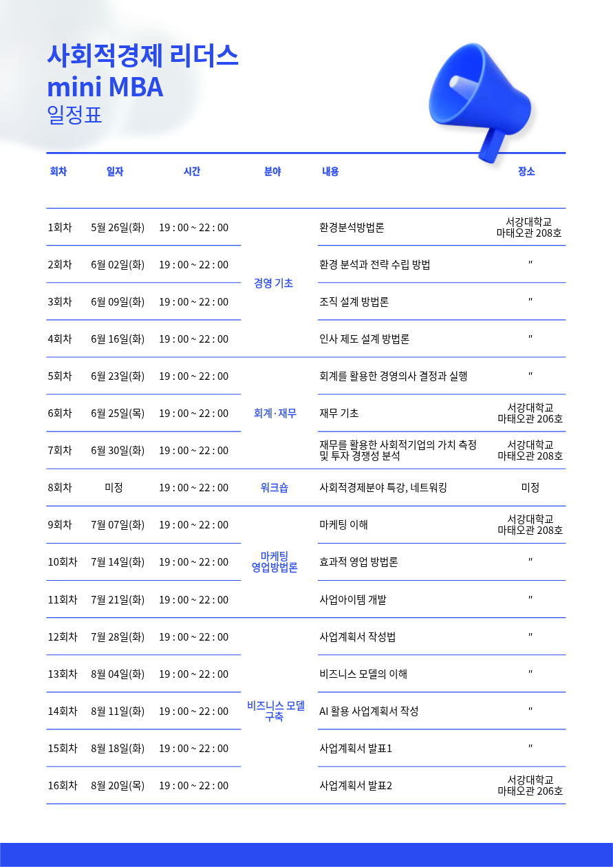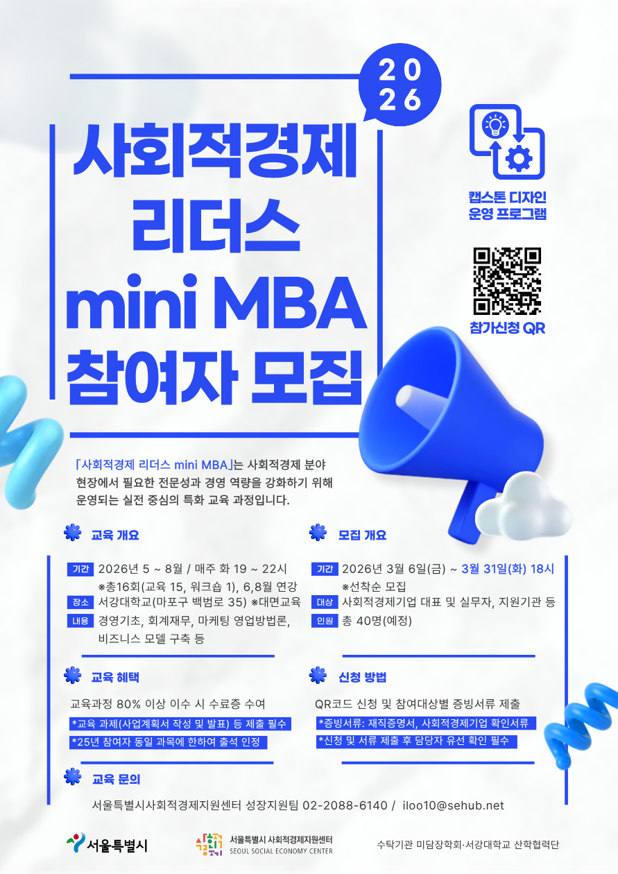 서울시사회적경제지원센터(수탁기관 미담장학회·서강대학교 산학협력단)에서는 사회적경제 분야 현장에서 필요한 전문성과 경영 역량 강화를 위한 실전 중심 특화 교육 과정인 ‘사회적경제 리더스 mini MBA 과정’ 2기 참여자를 아래와 같이 모집합니다. 많은 관심과 참여 바랍니다.