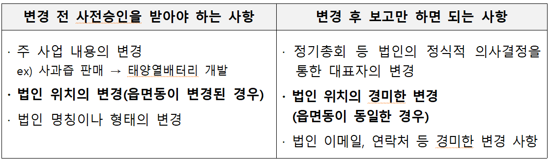 (A) 마을기업이 주사업, 법인의 위치, 명칭, 형태 등을 변경하는 경우 사전에 ‘마을깅버 법인 운영계획 변경 신청서'(마을기업 시행지침 p.93)를 관할 기초자치단체에 제출하고 승인을 받아야 합니다.