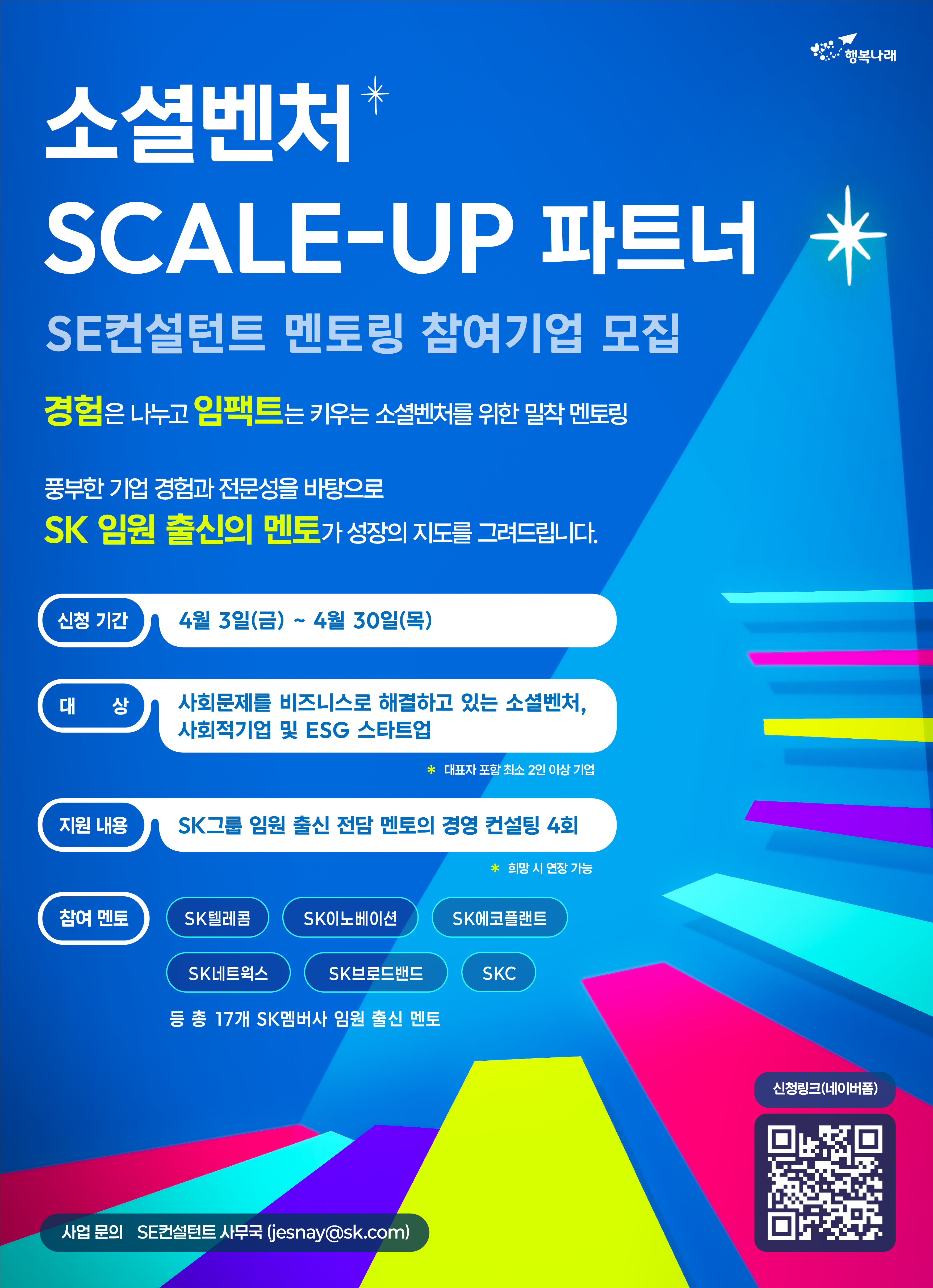 소셜벤처 SCALE-UP 파트너 SE컨설턴트 멘토링 참여기업 모집(~4/30)