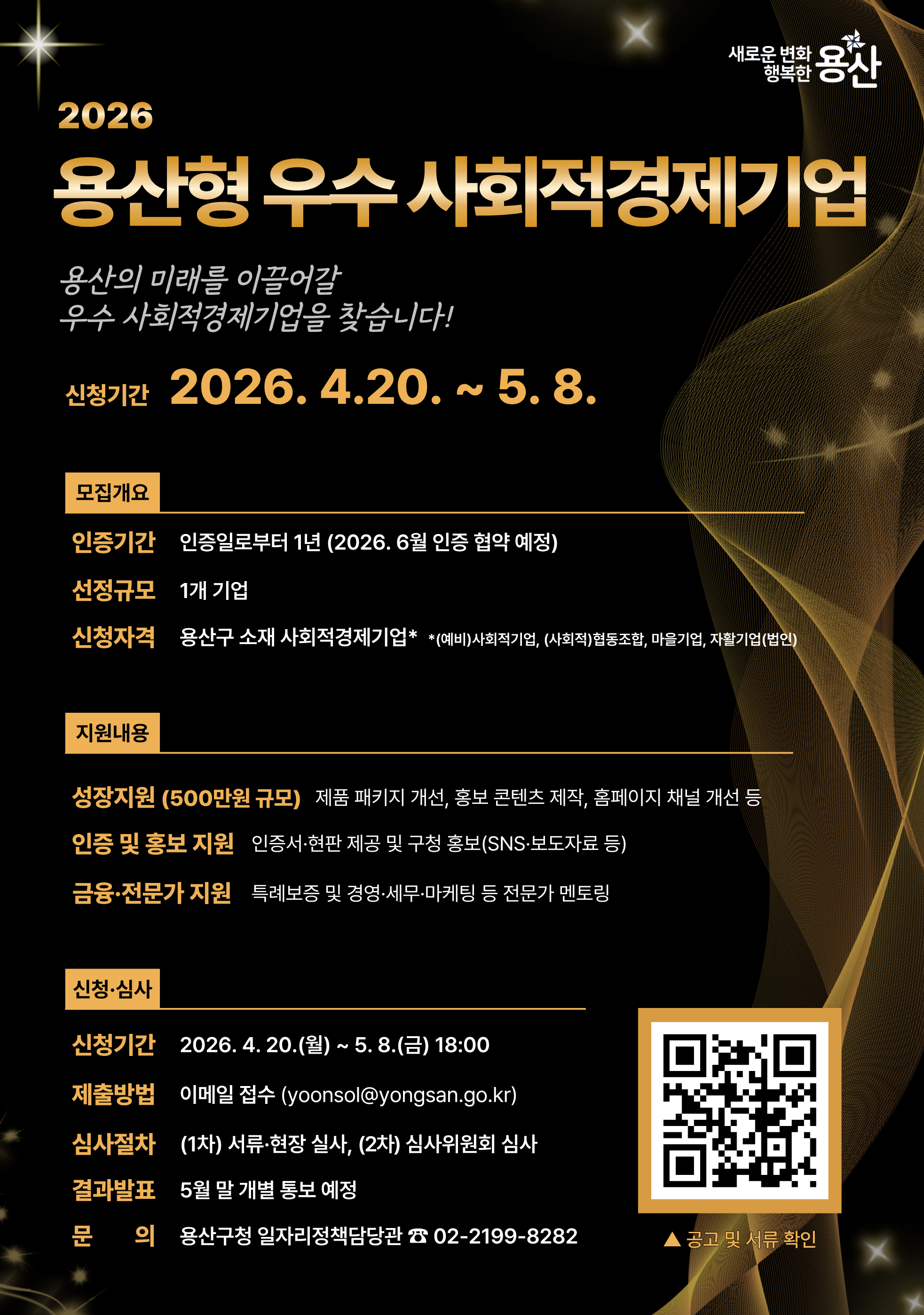 서울특별시 용산구에서는 관내 사회적경제기업 중 우수기업을 발굴·인증하여 기업의 신뢰도를 높이고, 맞춤형 성장 지원을 통해 지속 가능한 경영 기반을 강화하고자 「2026년 용산형 우수 사회적경제기업 인증」 계획을 다음과 같이 공고하오니 역량 있는 기업의 많은 참여 바랍니다.